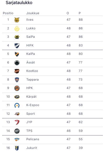 Lukko on sarjataulukossa toisella sijalla 86 pisteellä. HIFK:n pottiin on puolestaan kertynyt 83 pistettä, joten joukkue jatkaa myös sarjataulukon kärkikahinoissa ja on tällä hetkellä neljäntenä. Juuri ennen maajoukkuetaukoa stadilaiset esittikin oivaa virettä kolme voittoa tuoneen liigaviikon myötä. Tällä viikolla tavoite on täysin sama, joten Nordiksen iltama tarjoaa monessa mielessä mielenkiintoisen kärkikamppailun.