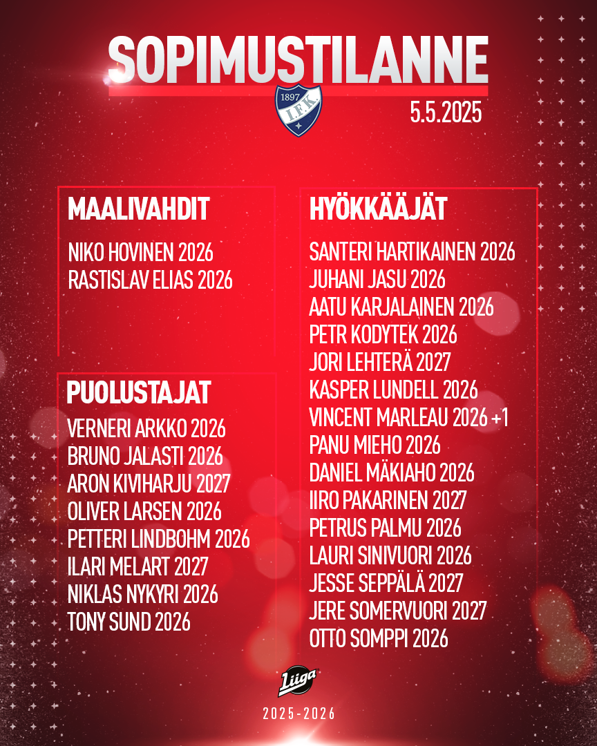 Maalivahti Niko Hovinen sekä hyökkääjä Petrus Palmu jatkavat HIFK:ssa myös alkavan kauden 2025-2026.