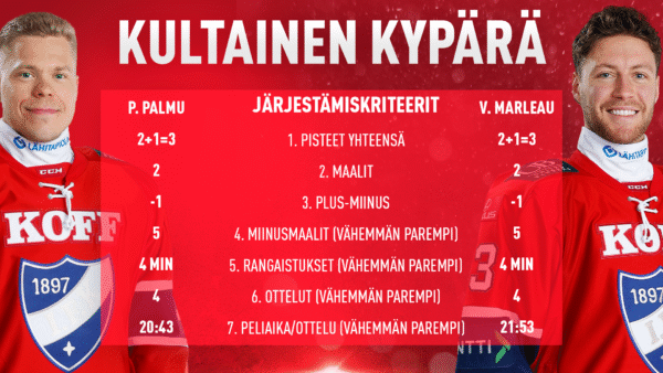Kultaiset kypärät otettiin Liigassa käyttöön eilen perjantain kierroksella. HIFK:ssa ensimmäisenä kultakypärän päähänsä vetää hyökkääjä Petrus Palmu. Palmulla ja Marleaulla on identtiset tehotilastot kuuden ensimmäisen valintakriteerin osalta. Ensimmäinen ja tässä tapauksessa merkittävä ero syntyy peliajan suhteen.