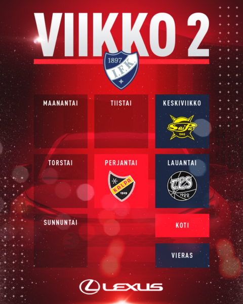 HIFK skulaa tällä viikolla kolme matsia. Keskiviikkona joukkue matkustaa Lappeenrantaan yhden Liika-kauden komeetan SaiPan vieraaksi. Perjantaina pelataan viikon ainoa kotona, kun KalPa vierailee Nordiksella. Lauantaina Fanclub järjestää megamatkan Turkuun TPS-HIFK-matsiin.
