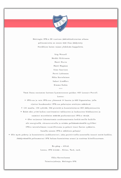 • Olet tarjonnut lukemattomia unohtumattomia hetkiä meille kaikille. Olit energisellä, uhrautuvaisella ja mitään pelkäämättömällä tyylilläsi IFK:n taisteluilmeen ruumiillistuma ja pelasit itsesi fanien sydämiin.
