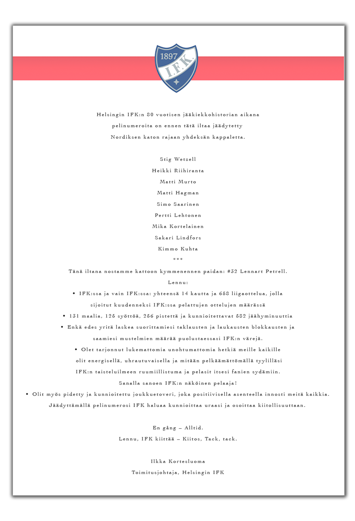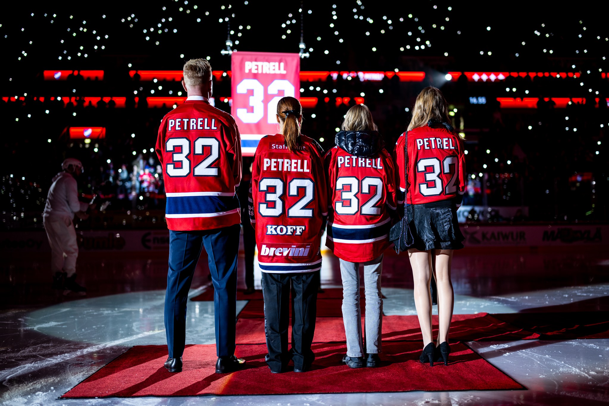 Lennart Petrellin pelinumero 32 jäädytettiin lauantaina 29.11.2025 komean ja koskettavan seremonian saattelemana. Lennun paita on järjestyksessään kymmenes, joka nousi Helsingin Jäähallin kattoon.