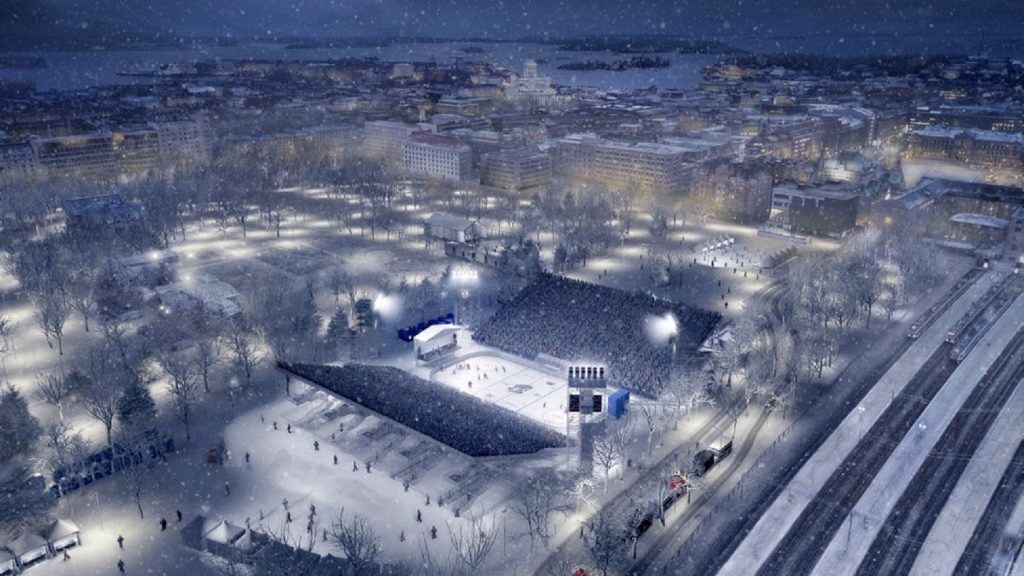 Kaisaniemen kentälle on rakennettu tapahtumaa varten katsomo 18 000 ihmiselle, jääkaukalo, 20 metriä korkeat valotornit, esiintymislava sekä mittavat ravintola-alueet. Suomen suosituimpiin yhtyeisiin lukeutuva Haloo Helsinki! soittaa alkulämmittelyiden jälkeen live-keikan ja virittää yleisön hyvään fiilikseen. Paula Vesala esittää Finlandia-hymnin ennen ottelun alkua.