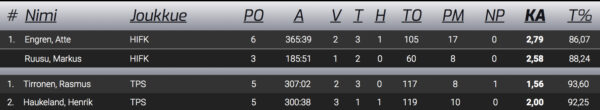 SaiPaa vastaan nollapelin torjunut Rasmus Tirronen ja kollegansa Henrik Haukeland löytyvät kumpikin sarjan maalivahtitilastojen kärkipäästä. Tirrosen päästettyjen maalien keskiarvo ottelua kohden on huiman matala 1,56 ja torjuntaprosentti 93,60. Norjalaisen Haukelandin vastaavat luvut ovat 2,00 ja 92,25.