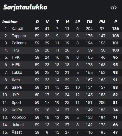 Runkosarjaa on tahkottu 59 ottelua ja homma on yhtä matsia vaille paketissa. Lähtöasetelmat pudotuspeleihin ratkaistaan tänään ja IFK tarvitsee voiton varmistaakseen paikkansa kuuden parhaan joukossa. Seitsemäntenä oleva Lukko on kaksi pistettä perässä ja HPK yhden pisteen edellä sijalla viisi.
