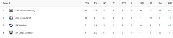 HIFK on lohkossa kolmantena, kolme pistettä Frölundaa jäljessä. Toisena on sveitsiläinen ZSC Lions, kaksi pistettä HIFK:n edellä.
