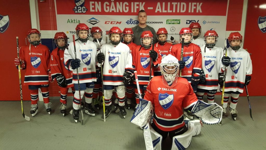 Joukkueiden avauskentälliset jäälle saattaneet IFK-juniorit pääsivät yhteiskuvaan Joonas Raskin kanssa.