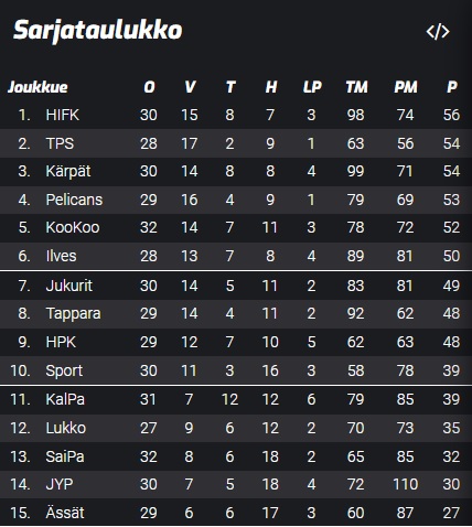 HIFK otti viikon matseista täyden pistepotin ja kun Kärpät, Pelicans ja TPS hävisivät omat pelinsä, HIFK nousi sarjataulukon ykköseksi. Lauantaina Nordiksella kaatui JYP värikkäiden vaiheiden jälkeen. Roni Hirvonen ja Jordan Schmaltz tekivät kaksi maalia mieheen ja Niilo Halonen oli tolppien välissä jälleen kuin muuri.